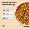 Deine warme Bio-Mahlzeit ist in nur 3 Minuten servierbereit. Das praktische Glas ist ungekühlt über 1 Jahr haltbar, perfekt, um Kontinuität in deine gesunde Ernährung zu bringen.