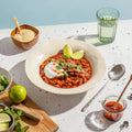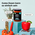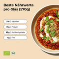 Verzehrfertige vegane Bio-Mahlzeit mit Erbsenprotein-Hack, ausgewogener Sweet-Chili-Sauce mit Schärfe und dezenter Süße, Gemüse und Bio-Zutaten in Glasform. 2 Portionen pro Glas. 100% Vegan. Glutenfrei. Ballaststoffreich. Ausgezeichnet mit PETA Award.